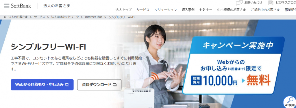 シンプルフリーWi-Fi約3,500〜5,000円下り最大1Gbps(エリアにより変動)事務手数料3,300円2年工事不要、シンプル料金体系で導入しやすい