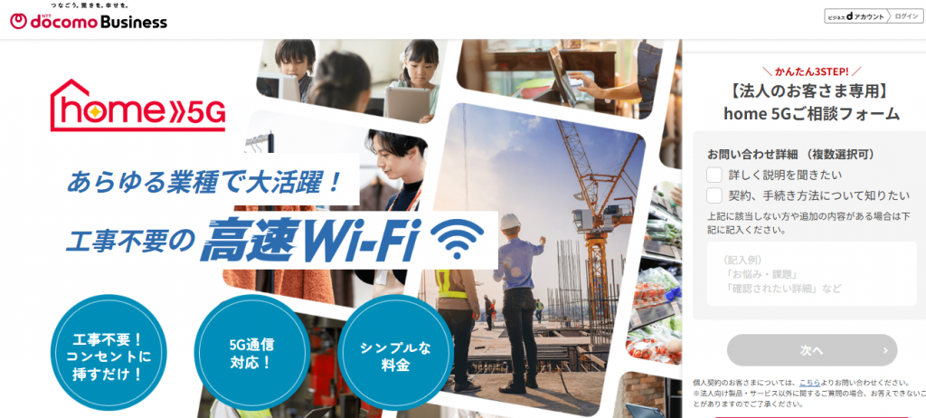 ドコモ home 5G約4,950円下り最大4.2Gbps(5Gエリア)事務手数料3,300円契約期間なし5G対応で高速通信、将来的な拡張性が高い