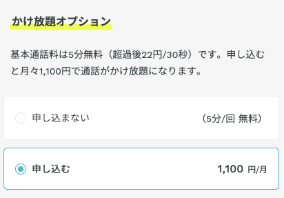 契約後に後からかけ放題オプションに申し込む場合は加入月の1,100円のオプション代金が日割り計算されません。