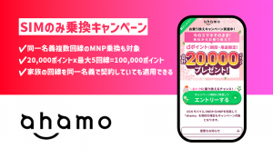 ahamoにSIMのみMNP乗り換えで、20,000pt=20,000円相当のdポイント(期間・用途限定)がもらえるキャンペーンが開催されています。