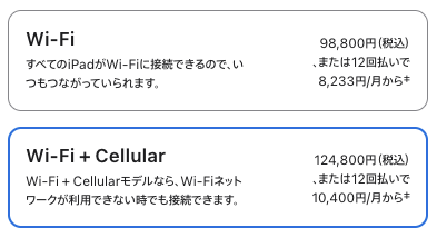 購入する場所 Wi-Fiモデル Wi-Fi+セルラーモデル
