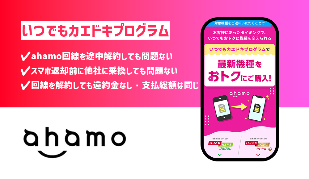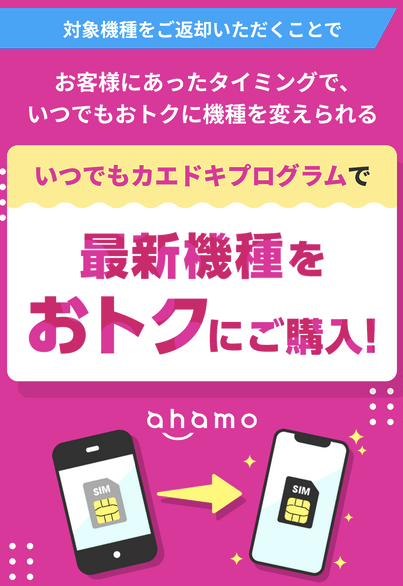 ahamoはドコモオンラインショップと同じ条件でいつでもカエドキプログラムを利用することができます。