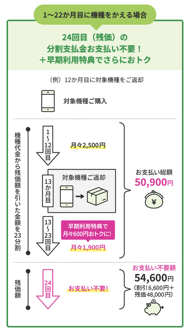 1〜22ヶ月目にスマホを返却することはできるが23ヶ月目まで端末代の支払いが続く