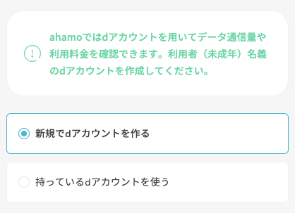 ahamoでは、利用者が18歳未満の場合、利用者登録した個人情報と同一のdアカウントを申し込みと同時に発行することができます。
