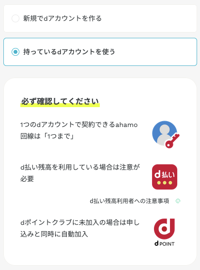ahamoの契約にはdアカウントとの紐付けが必須