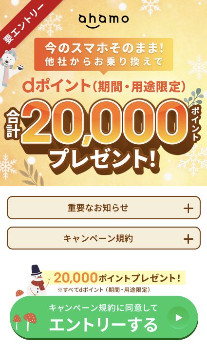 以下ボタンを押すと表示されるahamoサイトにある、dポイント20,000ポイントプレゼントのバナーをタップして、専用エントリーページにアクセス