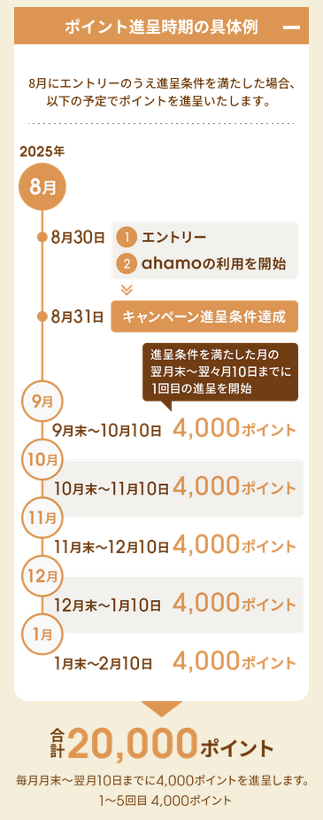 20,000ポイントのdポイントは一括で付与されず、5回に分けて付与される仕組みです。