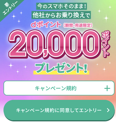 ahamoにSIMのみMNP乗り換えで、20,000pt=20,000円相当のdポイント(期間・用途限定)がもらえるキャンペーンが開催されています。
