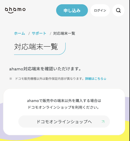 ahamoは公式サイトの対応端末一覧ページで、販売キャリアや販売メーカー、機種別の対応機種一覧を公開しています。