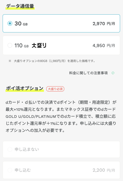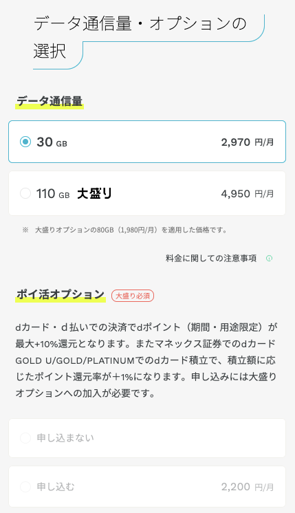 ahamoは月間30GBで月額2,970円の格安な基本プラン料金が最大の魅力なので、大盛りオプションの追加が必須なポイ活オプションはahamoのメリットと矛盾しています。