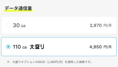 大盛りオプションに加入すれば、月額合計4,950円の料金で、月間データ容量を通常30GB→110GBに増量できます。