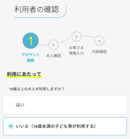 利用者の確認画面で、いいえ(18歳未満の子ども等が利用する)を選択すると、契約者の情報と利用者の情報をそれぞれ入力することができます。