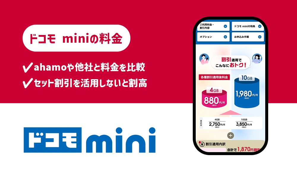 ドコモ miniの月額料金は意外と高い? ドコモは2025年6月5日よりドコモ MAXやドコモ miniなどの新料金プランを提供開始しました。 ahamo・ドコモ mini・ドコモ MAXを比較 いきなり結論 ドコモ miniの料金は3種類の割引を全部適用すると安い ドコモ mini 4G... -