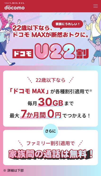 ドコモU22割は家族通話無料対象のドコモ MAXだけに適用可能なキャンペーンなので、利用者は家族間通話が無料になります。