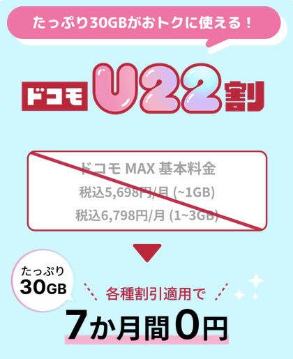 ドコモU22割は7ヶ月間限定で月額0円で30GB使える