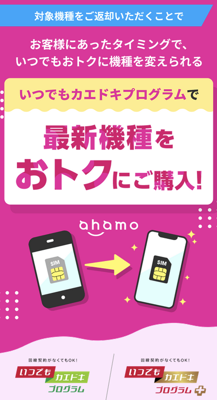 ahamoはドコモと同じ条件で、いつでもカエドキプログラム(2年返却)が利用できる。