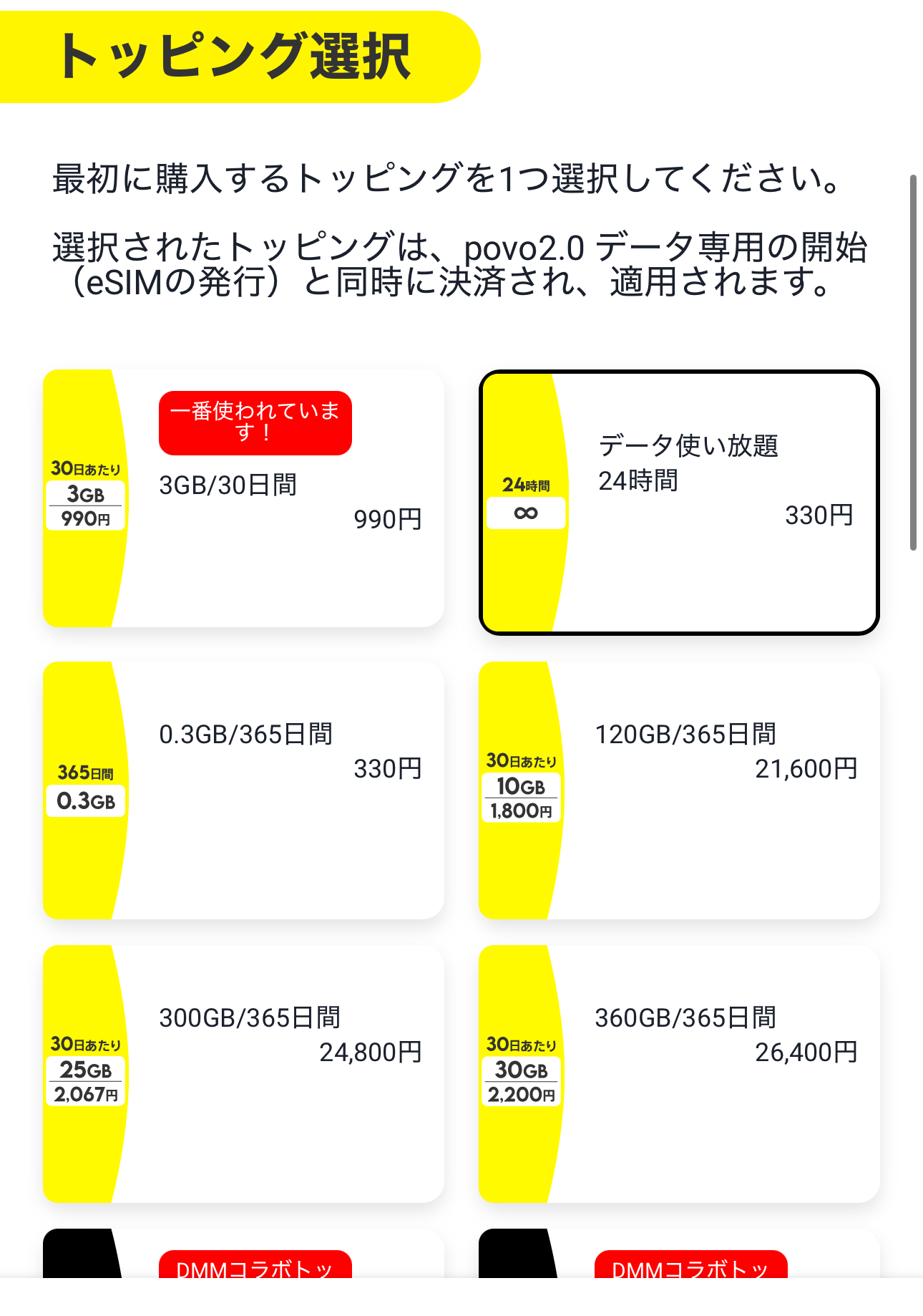 povoには通話+データプランとデータ専用プランの2つのベースプランが用意されています。