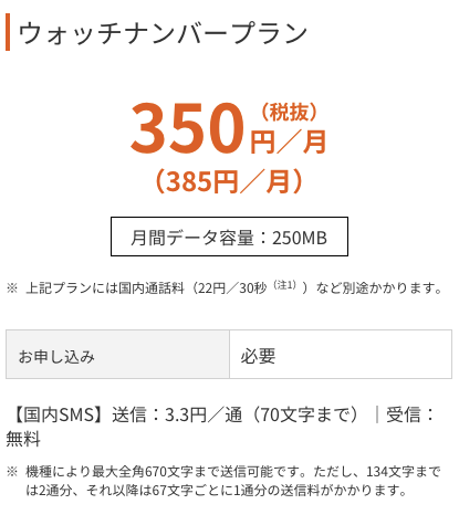 ウォッチナンバーで利用可能なデータ容量は月間250MBと少ない