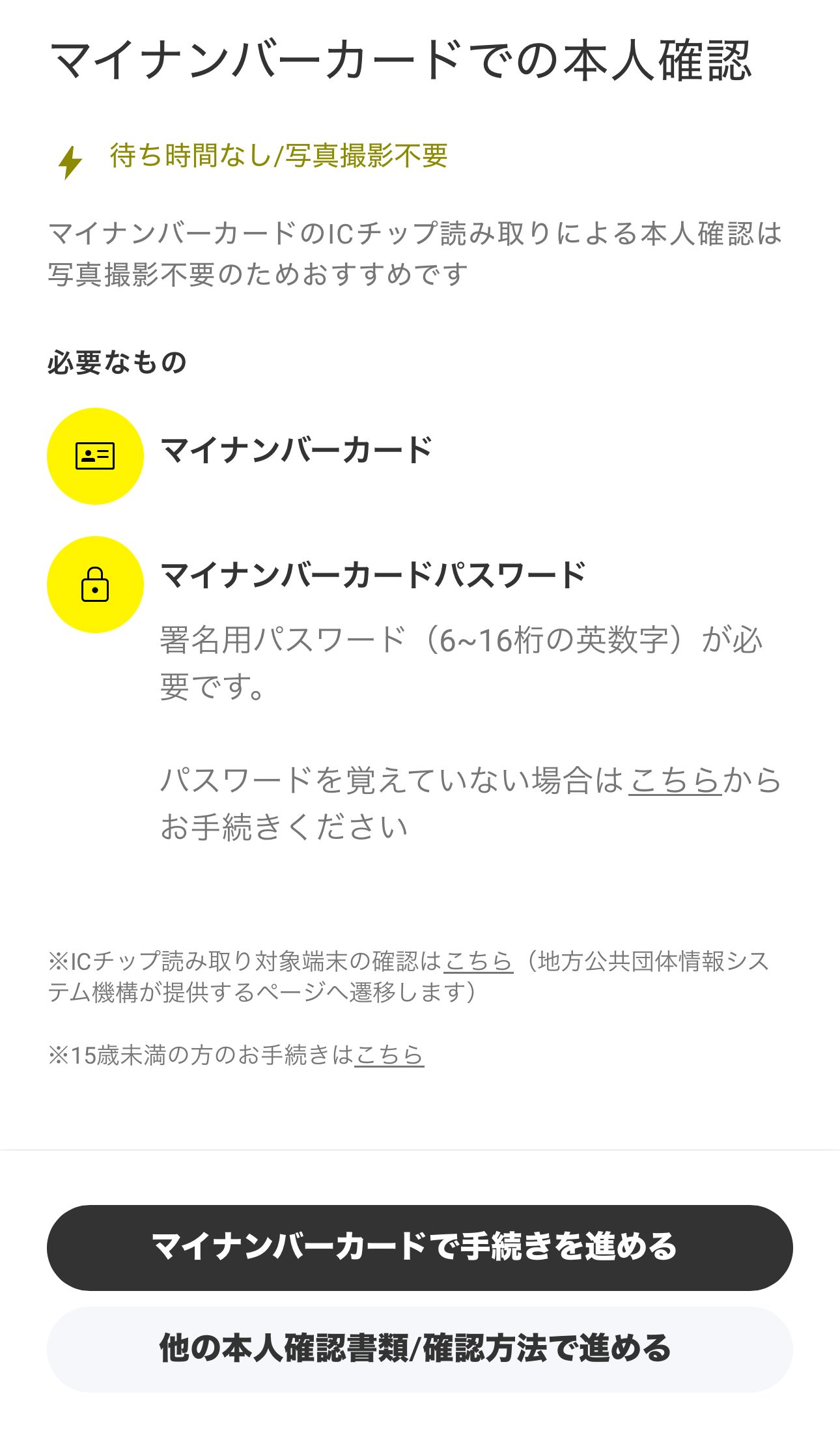 マイナンバーカードをお持ちの方は、マイナンバーカードのICチップ読み取りによって簡単に本人確認が完了します。
