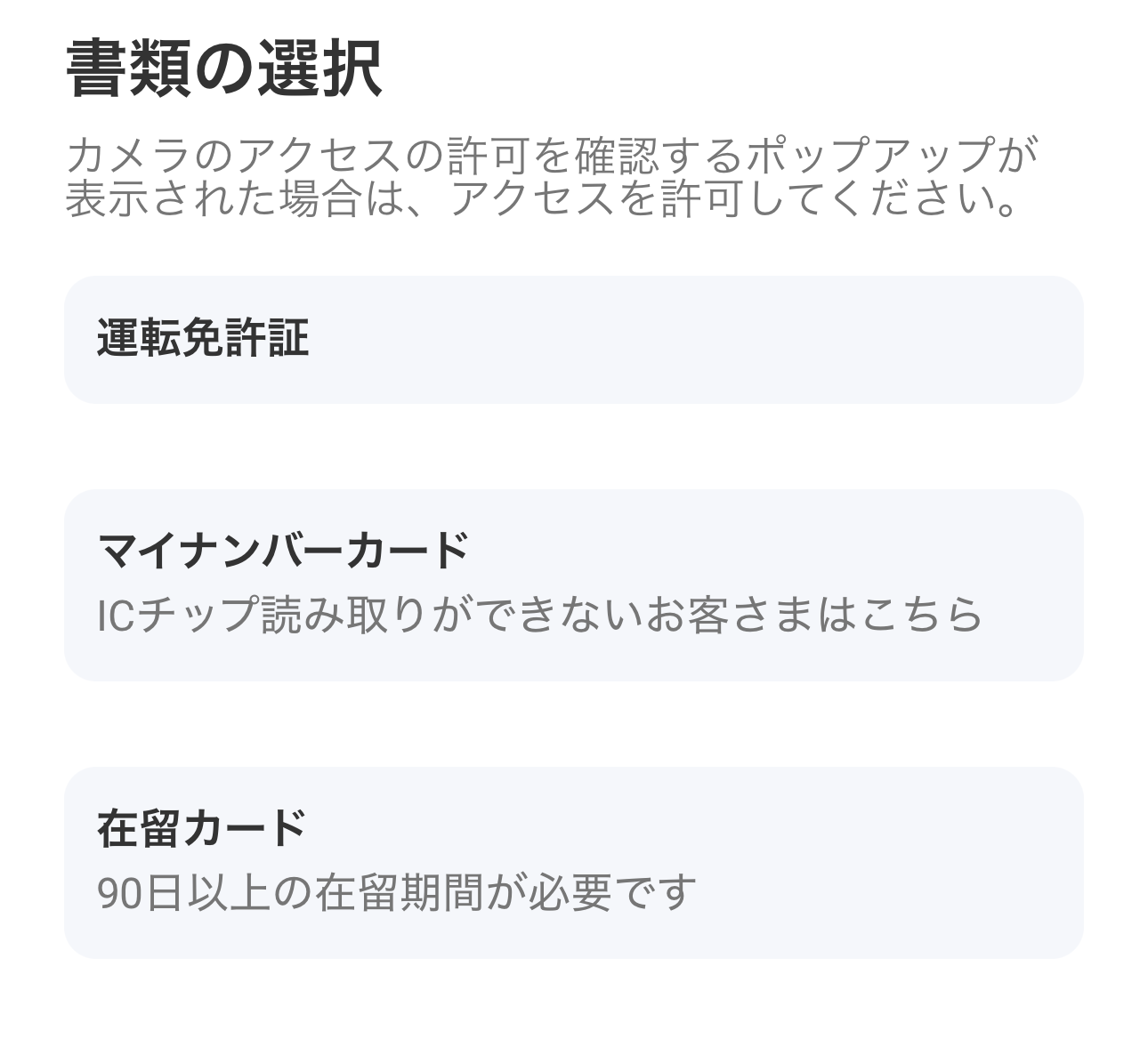 運転免許証や在留カード(日本国籍以外の方)を使って本人確認を行うことができます。