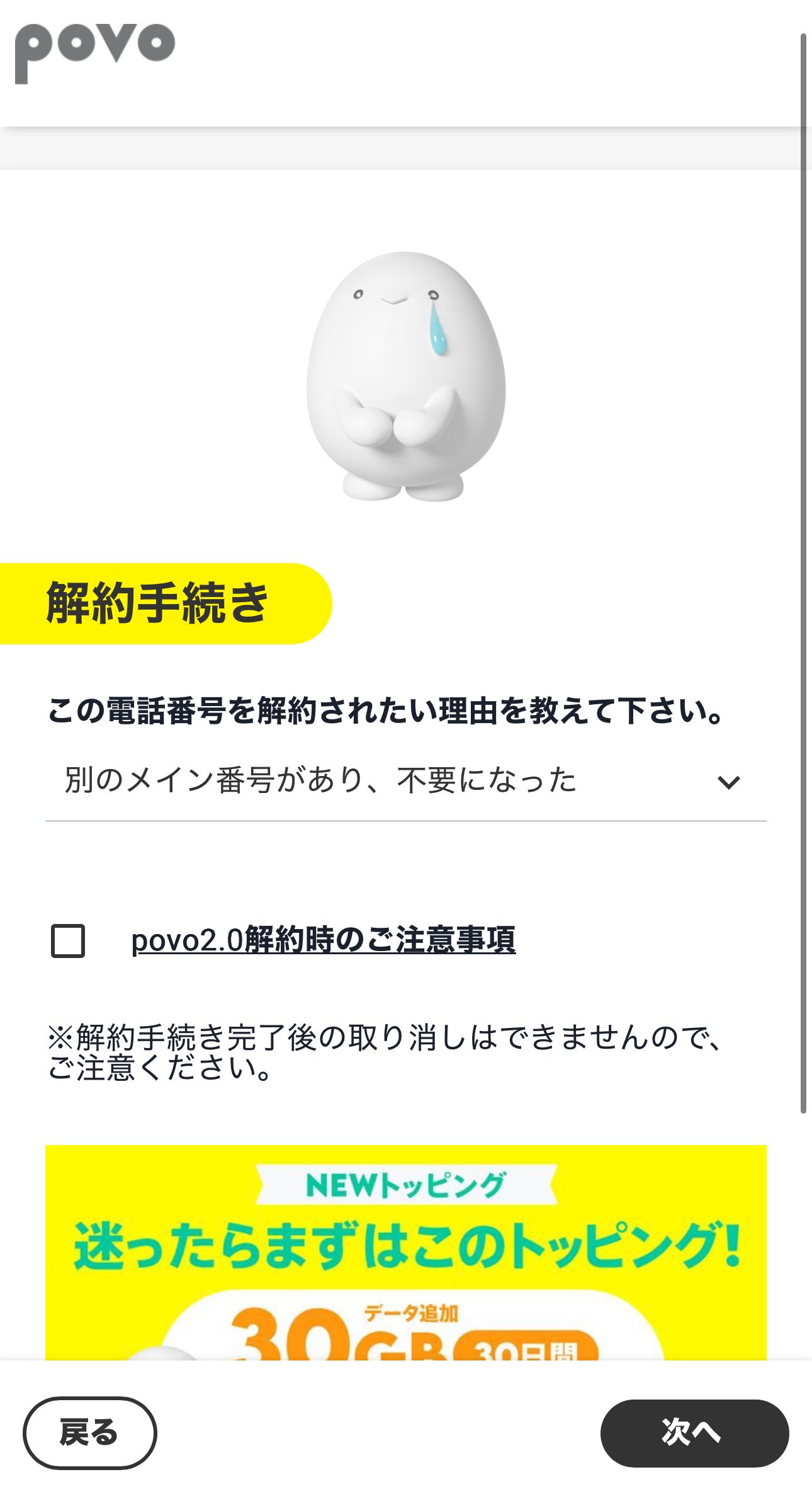 新しい電話番号で契約したpovo回線が手持ちのスマホで問題なく動作することが確認できたら、古い電話番号で契約したpovo回線は不要になります。
