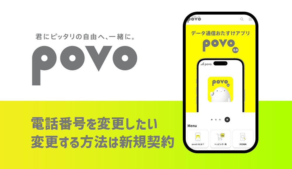 povoは契約済みの電話番号を別の番号に変更することができない。迷惑電話が多く電話番号を変えたい場合はpovoの新規契約を行い、元のpovoの回線を解約する。
