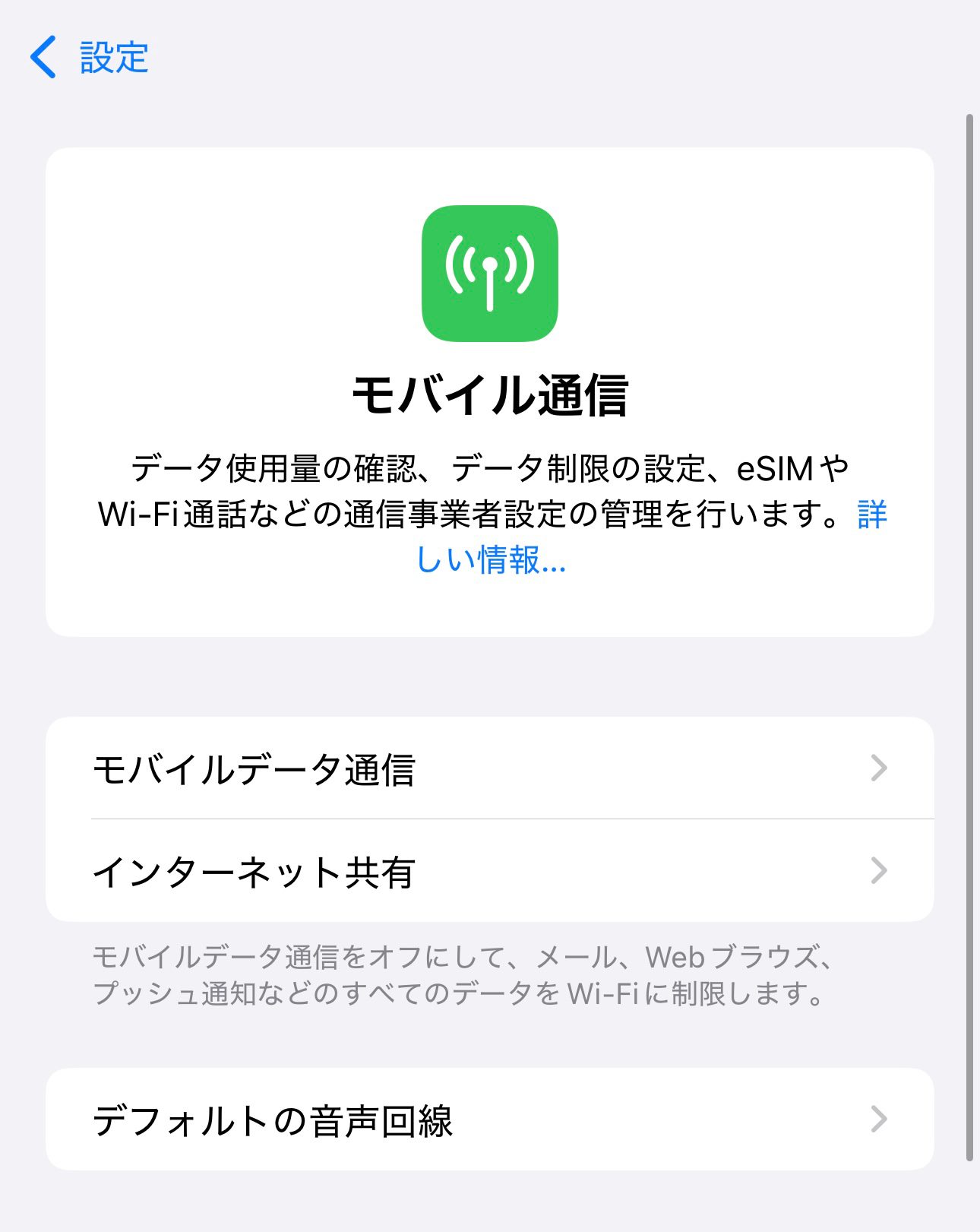 - モバイルデータ通信をタップ→データ通信で使用するSIMを設定できる