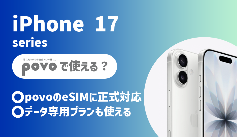iPhone 17、iPhone Air、iPhone 17 Pro、iPhone 17 Pro Maxの全4機種がpovoのeSIMの対応機種。データ専用プランをサブeSIMとして使うことも可能。