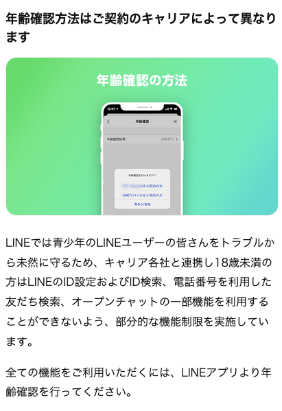 LINEの年齢確認は契約しているモバイル回線サービスの契約生年月日を元に18歳以上かどうかを判別する仕組みです。