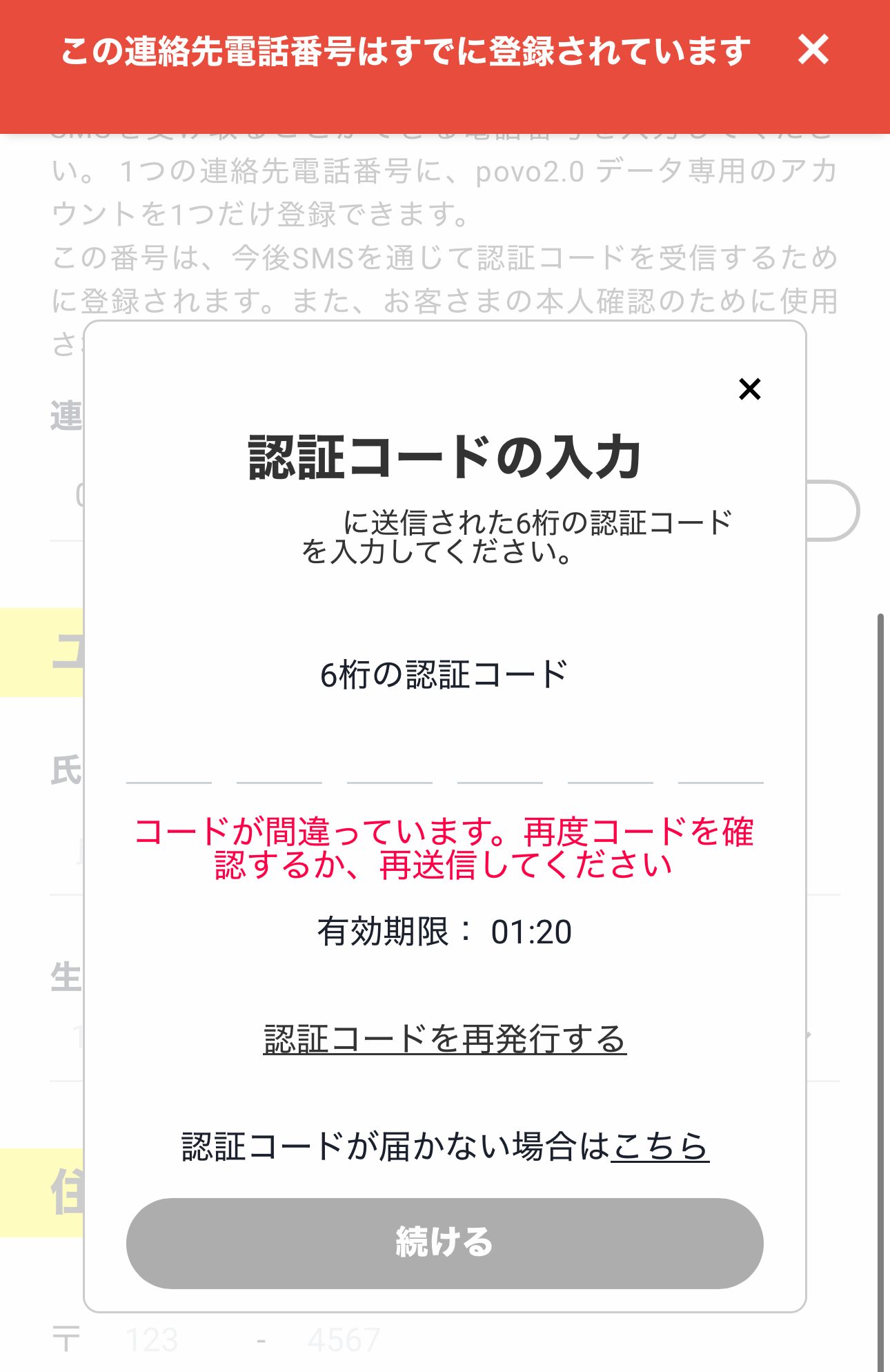 データ専用プラン登録時に入力済みの電話番号で、povoデータ専用プランの追加回線用のアカウントを作成しようとしたところ、以下のようなエラーが表示されて先に進めない。