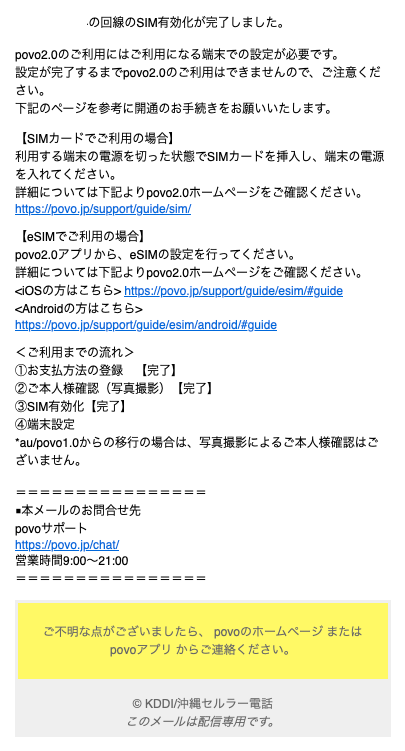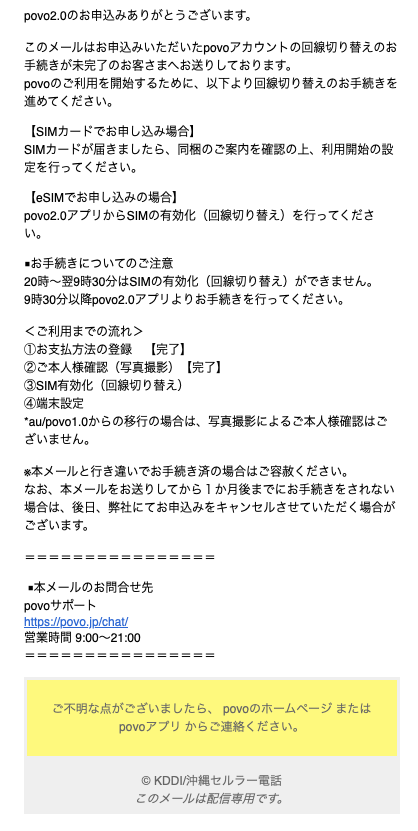 回線切り替えが一定期間未完了の場合、回線切り替えをお願いするメールがpovoから届きます。