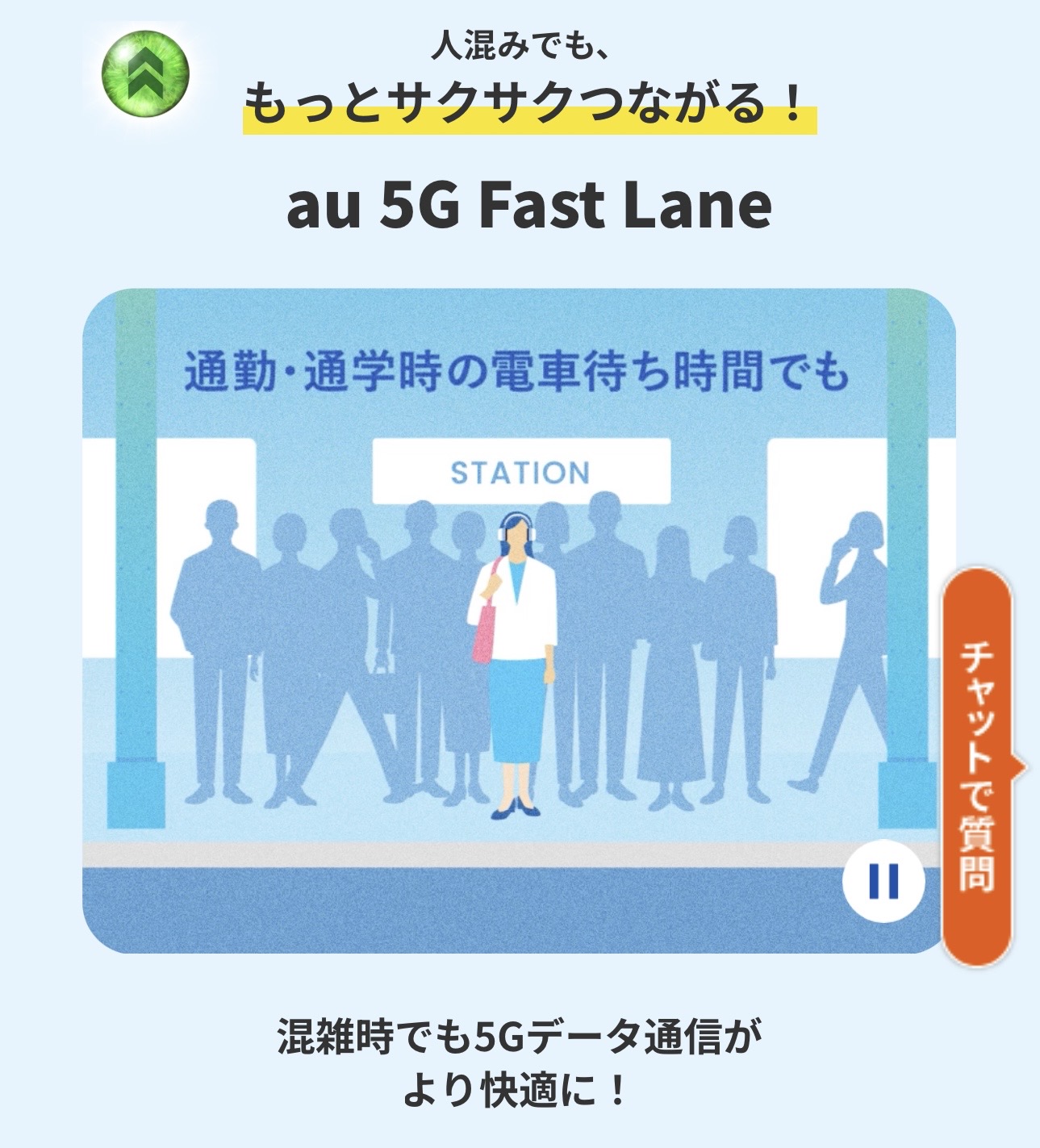 au 5G Fast Laneとは、auバリューリンクプラン利用者限定で、5G通信を他のau回線ユーザーよりも優先的に割り当てて混雑する場所で通信速度の低下を抑えるサービスです。