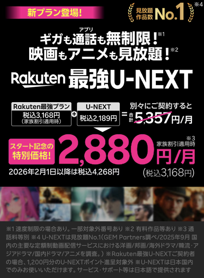 楽天最強U-NEXTは、月のどのタイミングで契約しても3,168円(2026年2月1日以降は月額4,268円)の料金がかかります。