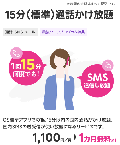 15分(標準)通話かけ放題オプションは1か月目の料金が無料になるキャンペーンを開催しています。