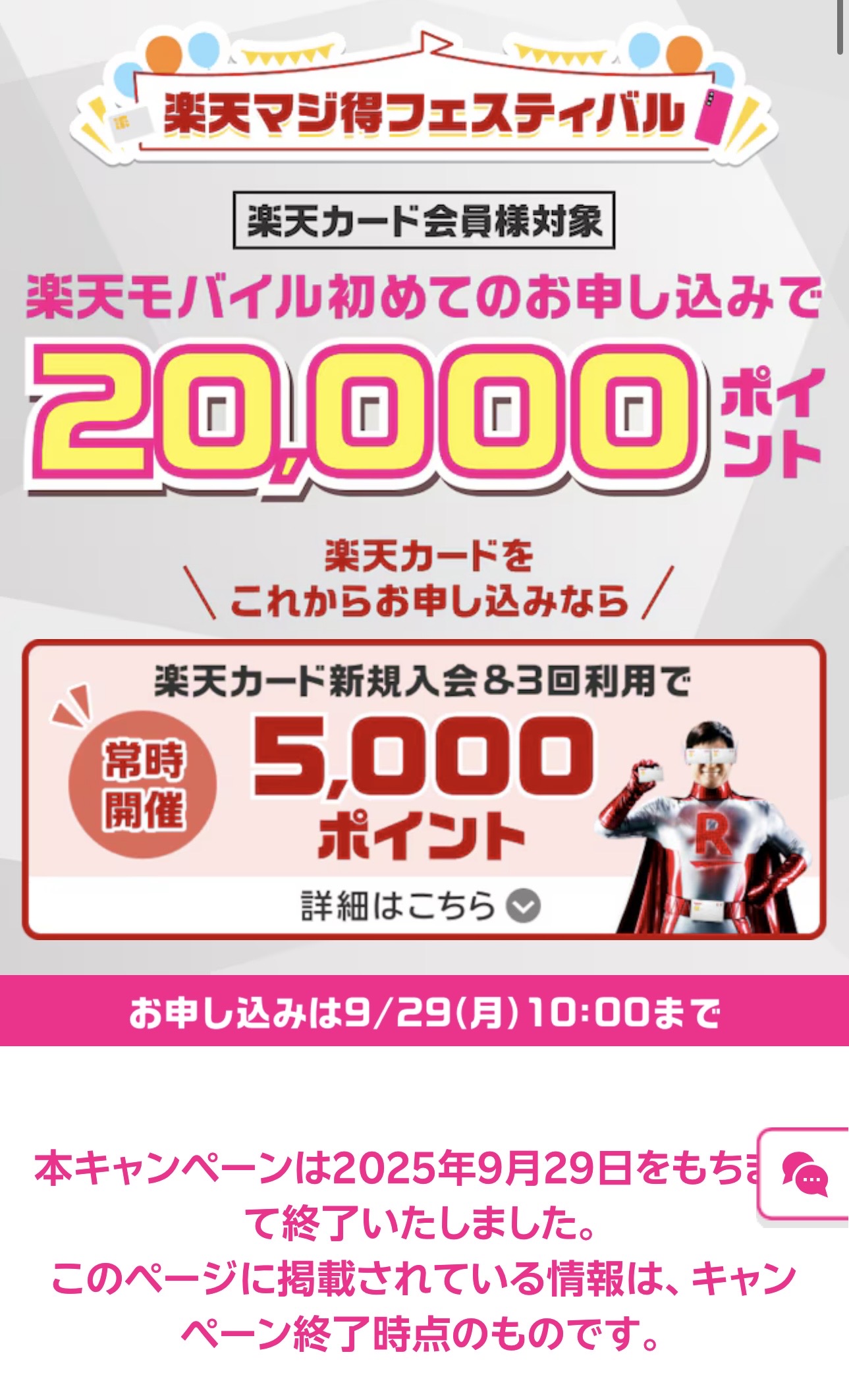 2025年9月の楽天マジ得フェスティバルでは、楽天モバイルと楽天カードを同時申込で20,000ポイント+10,000ポイント=合計30,000円相当の楽天ポイントが還元されました。