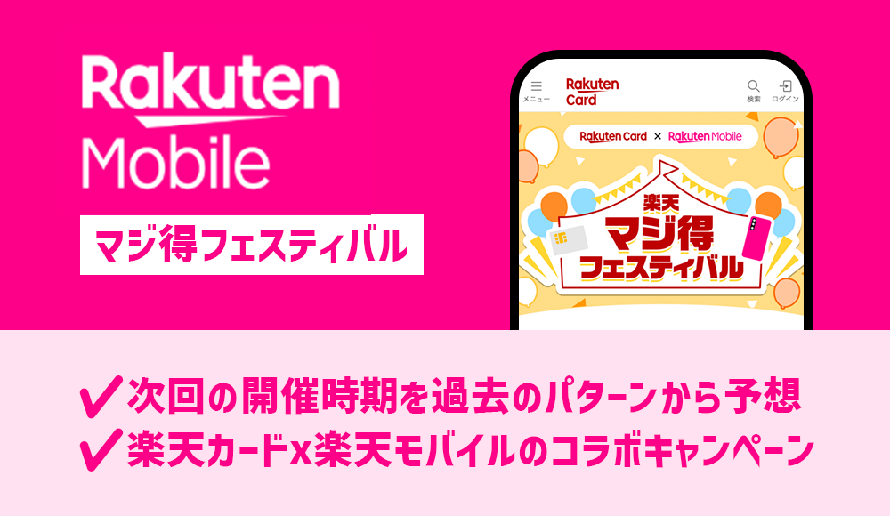 楽天マジ得フェスティバルは1年に3-4回程度の間隔で不定期開催されている楽天カード保有者限定の楽天モバイル申込キャンペーンです。