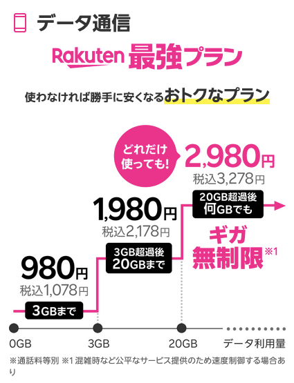 楽天モバイルは大手キャリア(MNO)ながら、月額料金は1,078円〜3,278円(税込)でデータ使い放題。コストパフォーマンスに優れています。