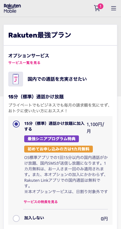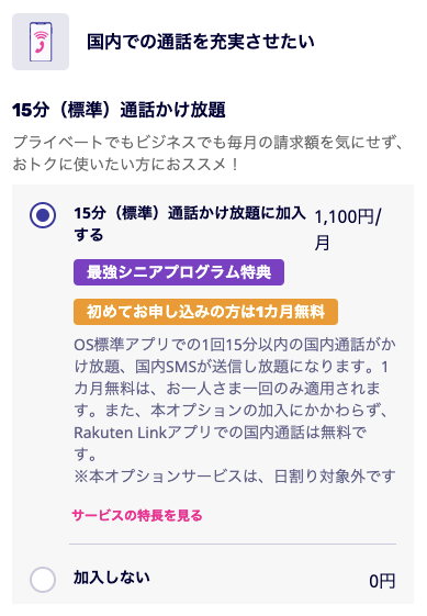 楽天モバイルをオプション無しで契約後、Rakuten Linkを使った通話の品質を体験してみて、もし満足できなければ15分(標準)かけ放題に後から加入することができます。