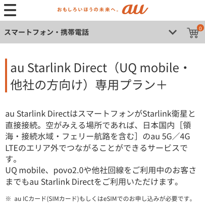 - au Starlink Direct 専用プラン+に加入すれば使える→月額1,650円の追加コストがかかる