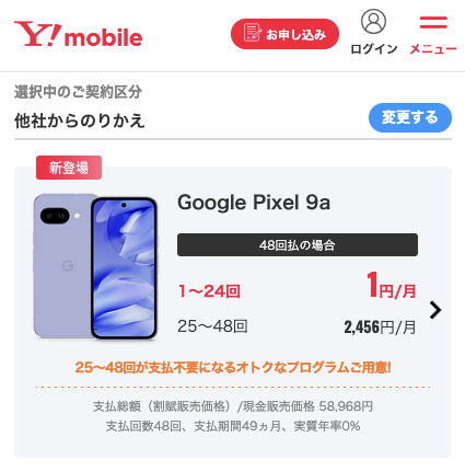 Google Pixel 9a(128GB)がワイモバイルで月々1円、支払総額24円で購入できます。