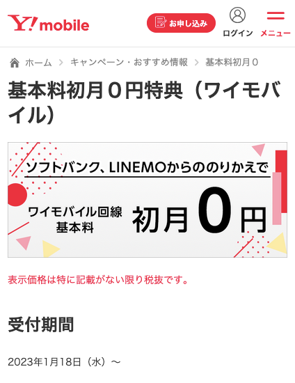乗り換え先のワイモバイルの初月料金はキャンペーンで無料