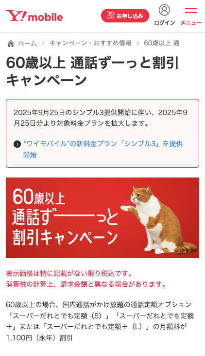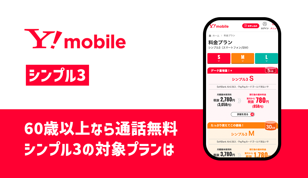 ワイモバイルのシンプル3も「60歳以上通話ずーっと割引キャンペーン」の対象