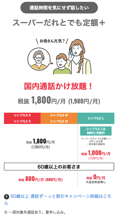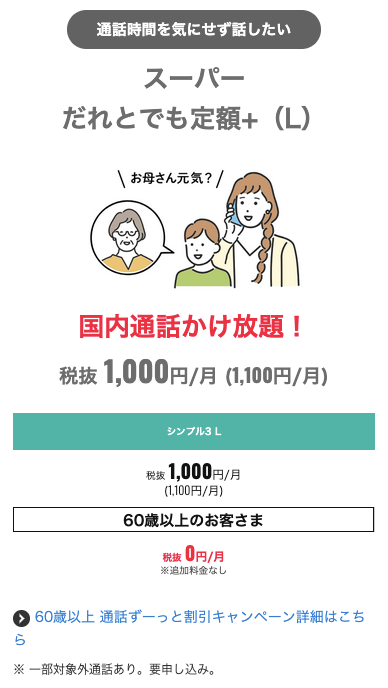 60歳以上の利用者がワイモバイルのシンプル3 Lに加入する場合、誰とでも通話料無料で電話がかけ放題になるオプションスーパーだれとでも定額+(L)の月額料金が無料になります。