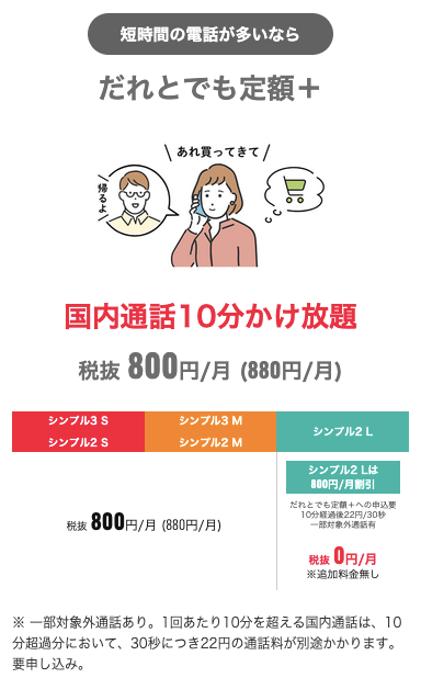 シンプル3 Lのみ「だれとでも定額+」が追加料金なしで加入できる