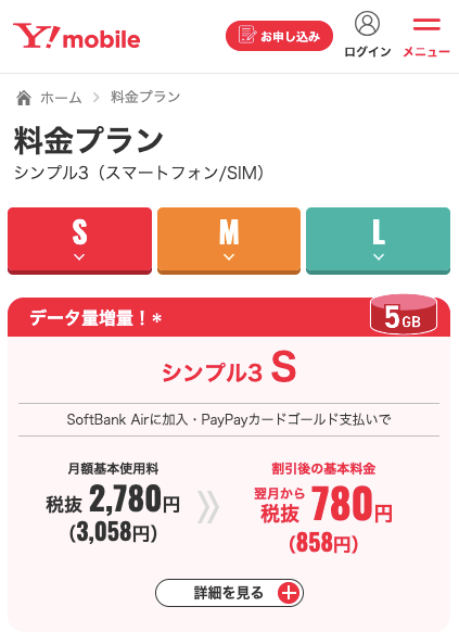 シンプル3 Sの各種割引適用後の料金は月額858円と、シンプル2 Sよりも手頃な値段です。