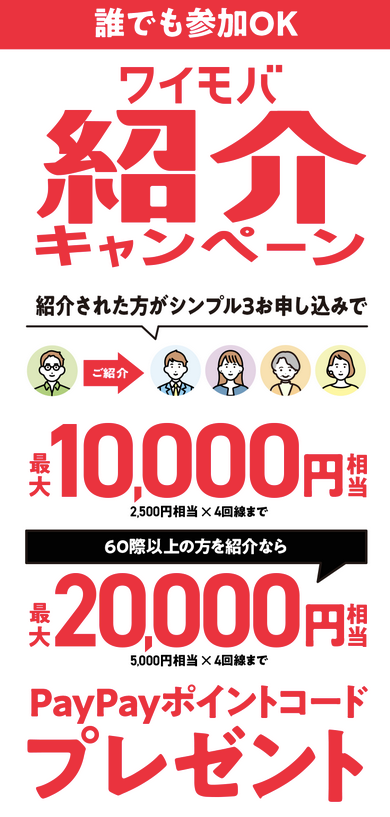 2025年8月1日から終了日未定の期間限定で、最大4人に紹介で最大20,000円相当のPayPayポイントコードがもらえるワイモバ紹介キャンペーンが開催されています。